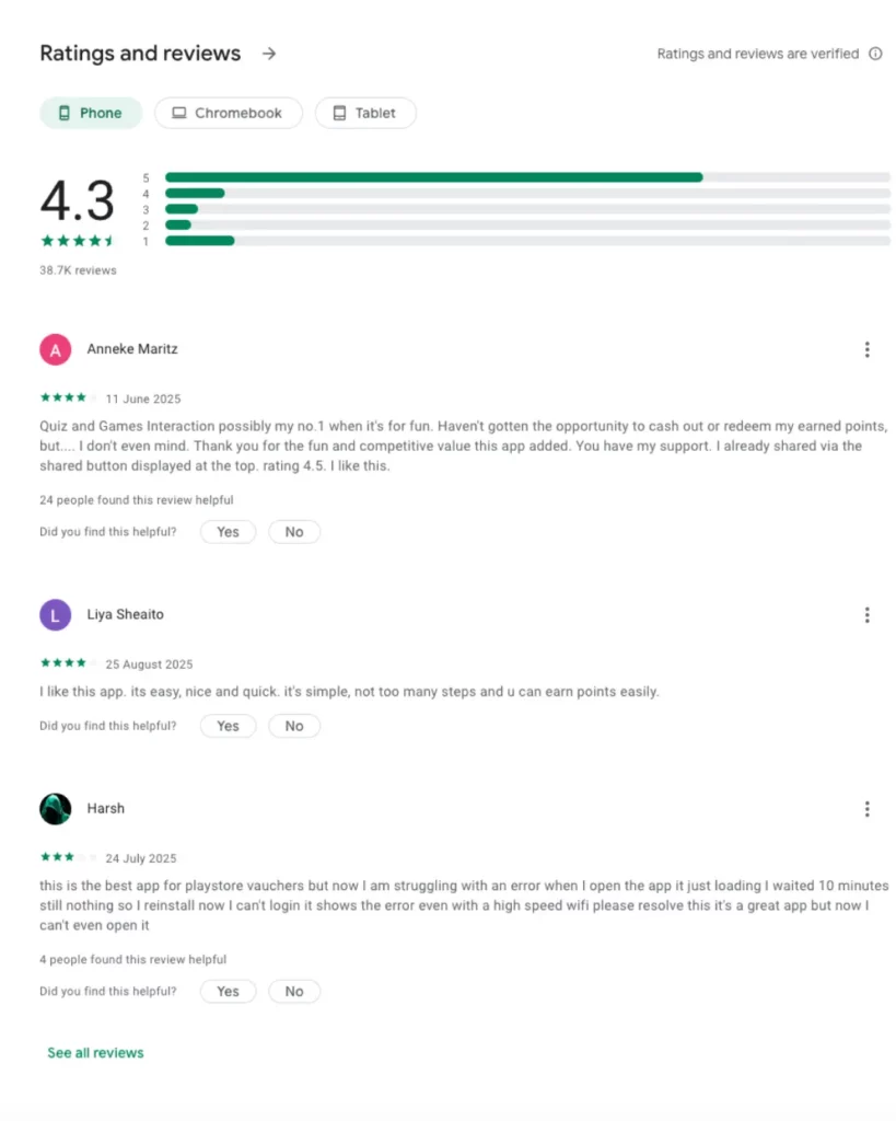 Yes. Our app is published on the official Google Play Store under the name “FreeGiftZone.” It’s safe to use, does not collect any sensitive information, and follows fair reward policies. Thousands of users have downloaded it and rated it 4.5 stars or more.